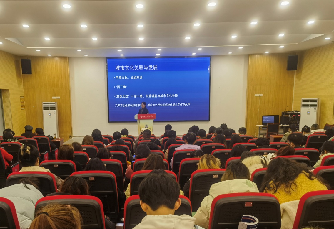 讲座伊始,舒莺教授以“什么是文化?”为引导,展开讲解。舒莺教授认为:“文化多样性与共同的价值取向归根为民族意识共同体”,通过对昆明、重庆城市文化形象比较,着重突出打造城市文化与形象的重要性。讲座中,舒莺教授详细梳理了昆明、重庆两城的地理位置、城市文化、文脉传承,分析了抗战西迁引发的文化共性,并列举了不同文人对城市文化内涵的感受,对双城城市文化进行关联,诠释了城市文化的内涵。