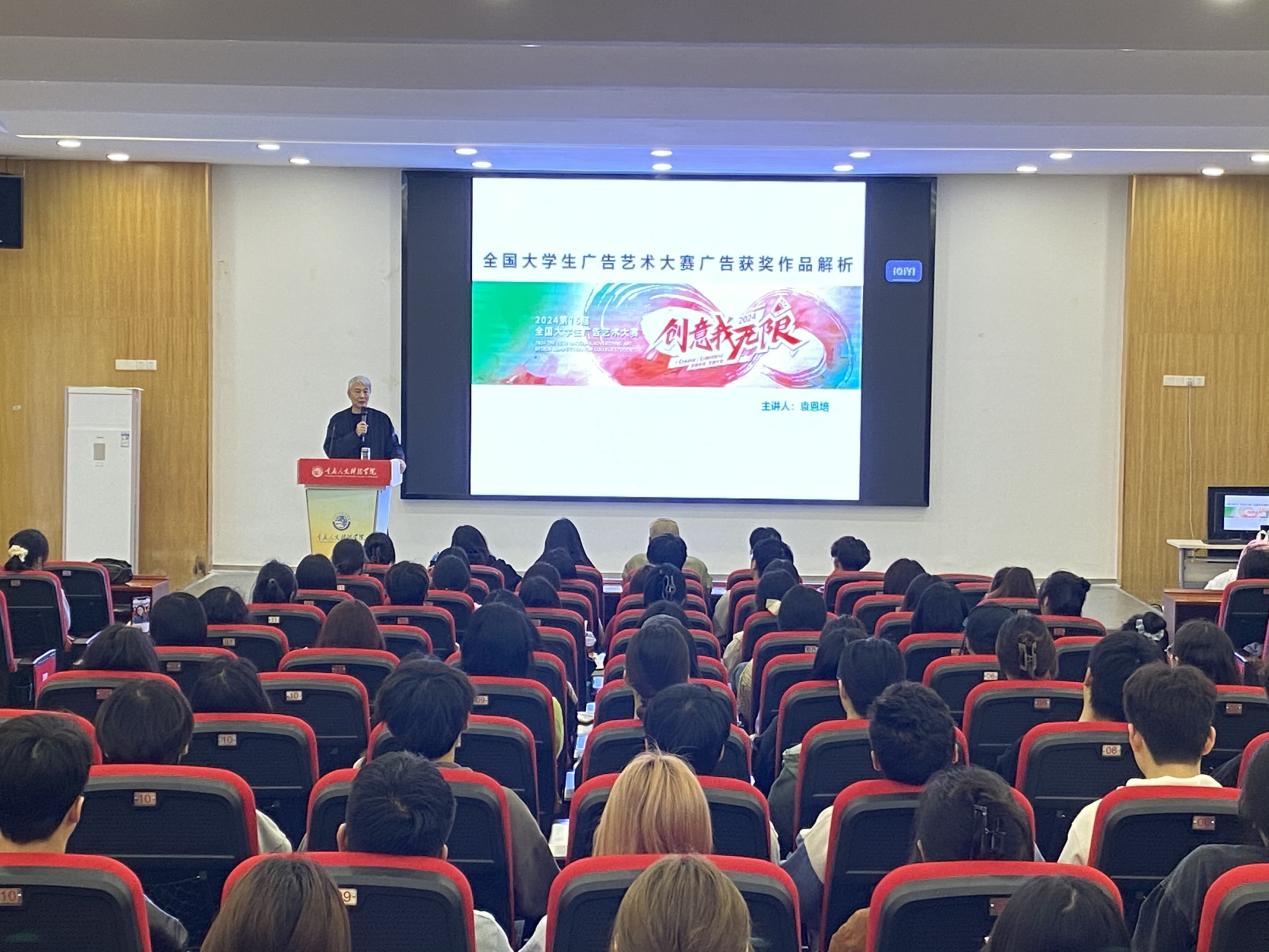 2024年4月9号下午,建筑与设计学院邀请袁恩培教授在雕塑园报告厅进行“第16届全国大学生广告艺术大赛”专题讲座。讲座由建筑与设计学院视觉传达设计专业教研室主任高彦彬主持,近100余同学参加了讲座。