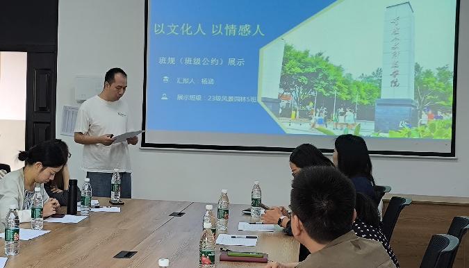 为进一步落实“三创一做”工作,加强班级班风、学风建设,建筑与设计学院于6月6日在慧思楼8203开展“定班规,展班风”班规评比比赛。建筑与设计学院党总支副书记梁宁华,辅导员陈钰、王珍妮担任评委。2022级辅导员李荷、谭粲然,2023级辅导员韩静、吴梦琴、郑馨雨、杨涵分别就自己班级设立的班规进行展示评比。
