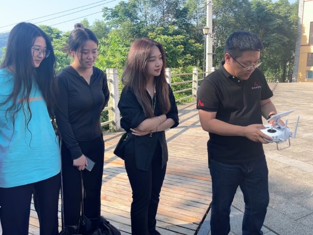 张友金首先对大疆无人机的基本概念、使用原理、专业运用场景等进行了详细介绍,并让同学们近距离接触无人机,了解无人机的操作界面,同学们初步对无人机的构造有了一定的认识。紧接着,以民族团结广场为起飞点,在无人机界面设置航拍区域并介绍无人机的飞行距离及续航能力,进行实际操控模拟,让同学们感受无人机航拍的实践过程,也让同学们从航拍视角了解了学校的校园空间格局,更清晰的掌握现实空间尺度。最后,同学们利用所学的基础知识进行上手尝试和实践练习,并用无人机进行了班级合照及视频的录制。