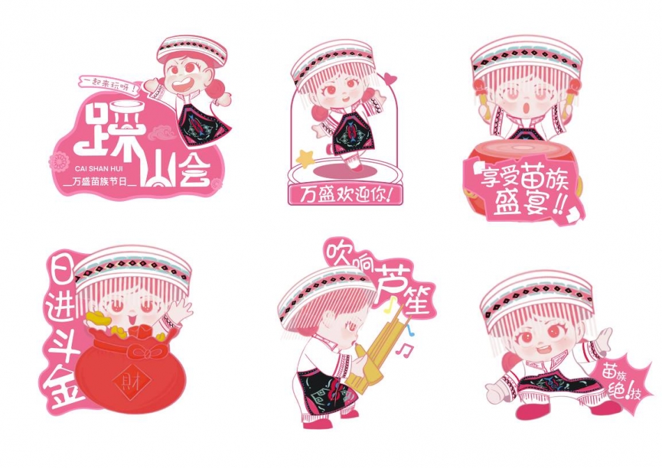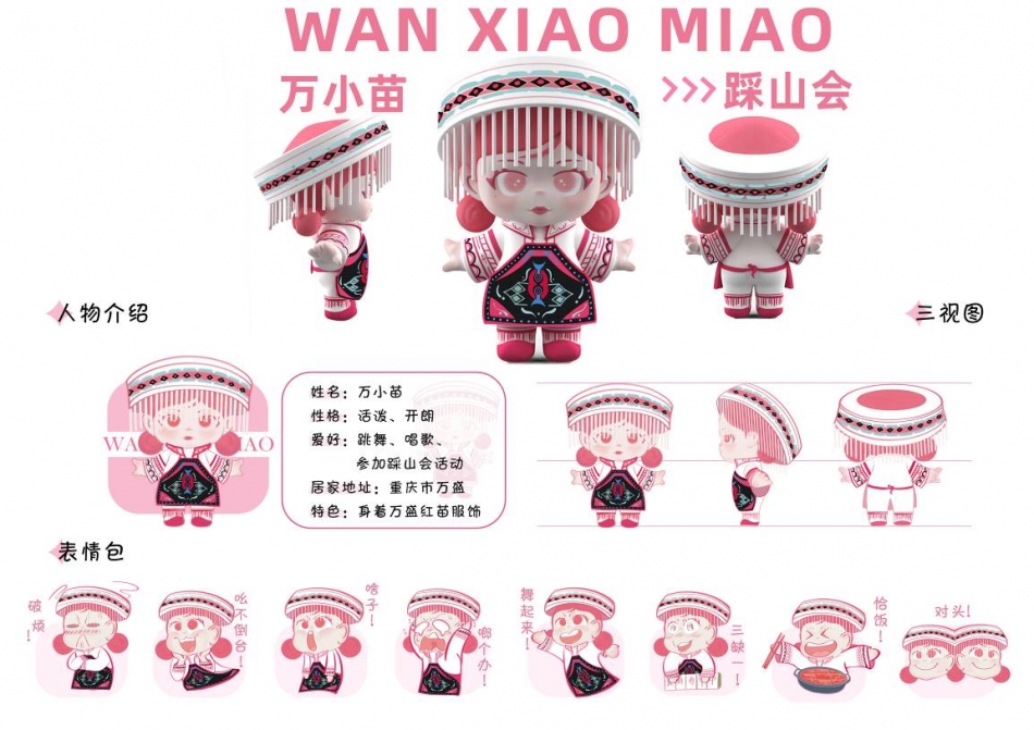 重庆万盛苗族的踩山会是首批重庆市非物质文化遗产,承载了深厚的历史和文化价值。作为苗族的重要节日,它起初是祭祀活动,后来演变成集祭祀、娱乐、社交为一体的民俗节日。作品主要针对“踩山会”节日特色进行文创产品设计,以踩山会的内容为主,对当地传统习俗进行调查研究,例如:吹芦笙、跳苗舞、赤脚斜走大刀、祭祀大典等独居苗家风情的传统习俗,并根据这些传统节日的特色场景创作出具有踩山会文化气息的插画,使人们感受到踩山会文化的热情。然后根据万盛苗族的服饰,提取具有代表性的元素及符号,设计出具有踩山会文化特性的IP形象以及文创产品,并应用于踩山会活动以及旅游宣传中。