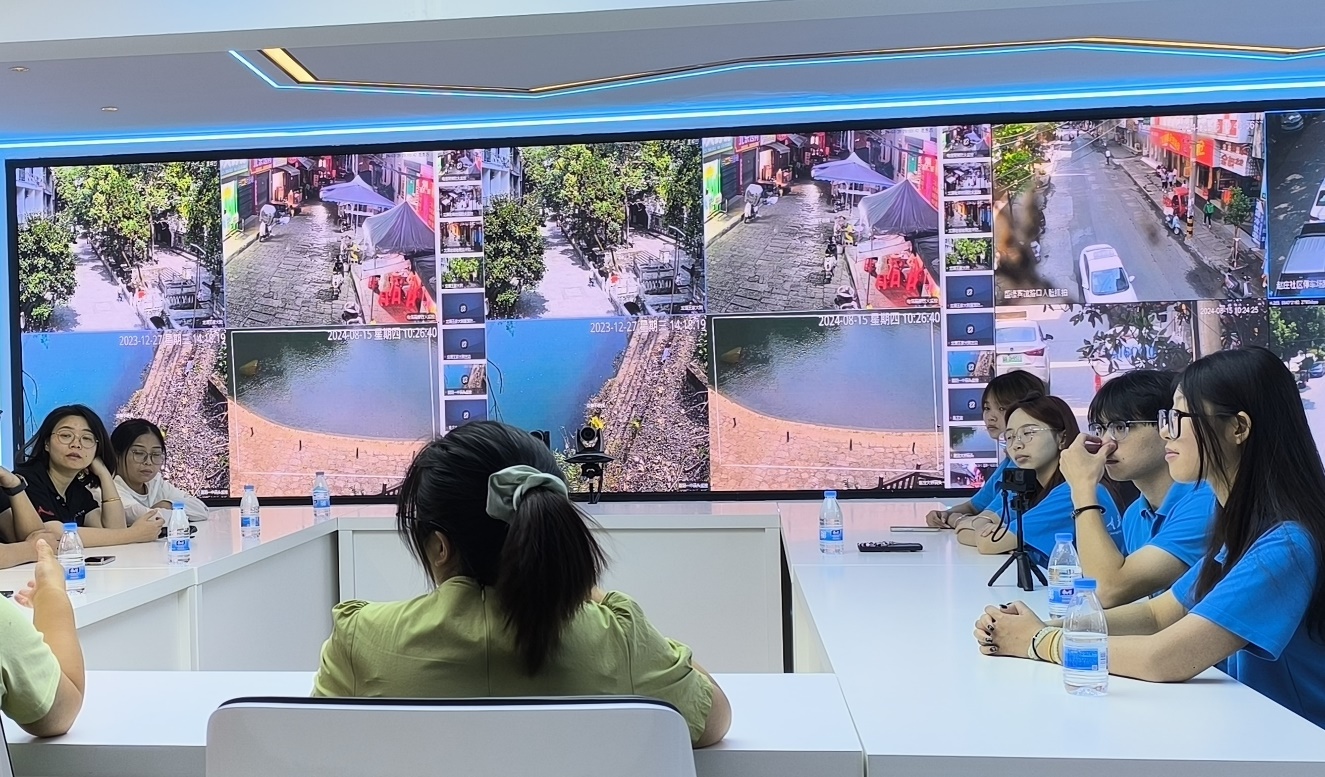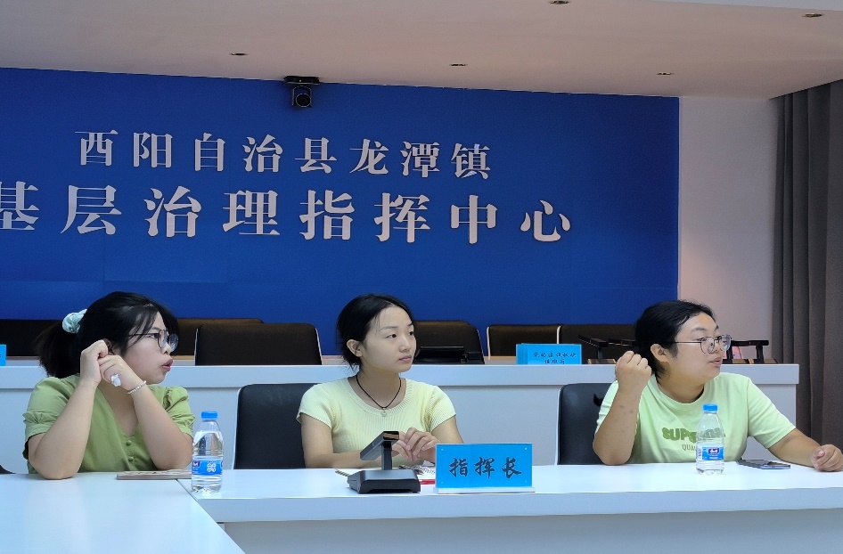 在酉阳县龙潭镇基层治理指挥中心的智慧大屏上,镇域信息、节点画面等数据实时展现。实践团了解到龙潭镇数智化基层治理的相关情况,龙潭镇通过在镇街相关重要节点安装智能摄像头,使用数智化管理系统进行大数据分析,及时对火警风险及溺水风险进行预警,同时能优化进出镇道路交通,实现古镇基层治理智慧化。