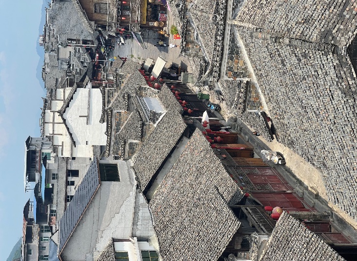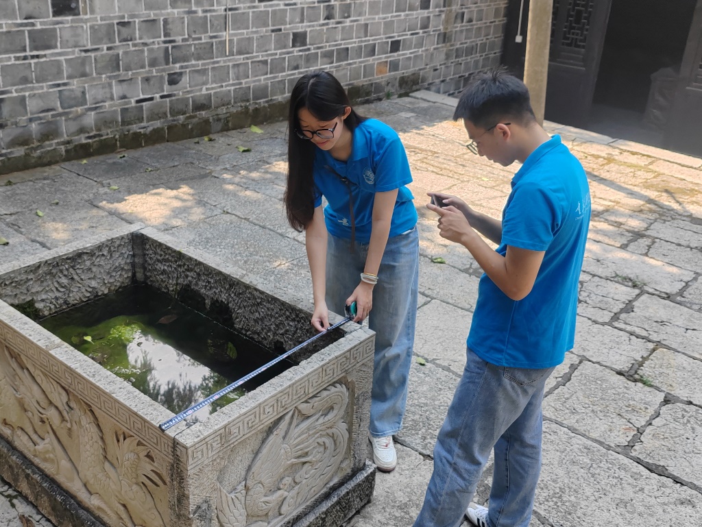 在酉阳县龙潭古镇老街,实践团建筑学小组实地调研了古镇明清建筑群及当地传统民居。古镇建筑群青砖花墙盖瓦,石灰粉檐,庭院幽深,极具特色,实践团通过三维数字扫描技术与传统测绘手段,对王家大院进行高精度测量与记录,获取详细建筑数据。使用无人机倾斜摄影技术,从多个角度获取古镇建筑群外立面影像信息,为后期为古建数字化保护和微景观设计提供数据支持。