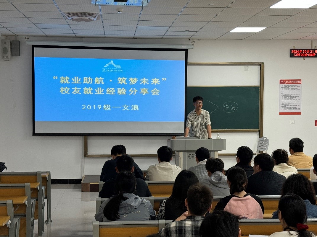 为引导我院学生树立积极理性的就业观,了解现今行业发展趋势以及如何选择合适的实习和就业岗位,进一步明确努力方向,建筑与设计学院于2024年11月4日13:00在16教113教室开展“就业助航·筑梦未来”校友就业分享会。本次宣讲会邀请了2019级毕业生文浪作就业经验分享,我院100余名应届毕业生参会。