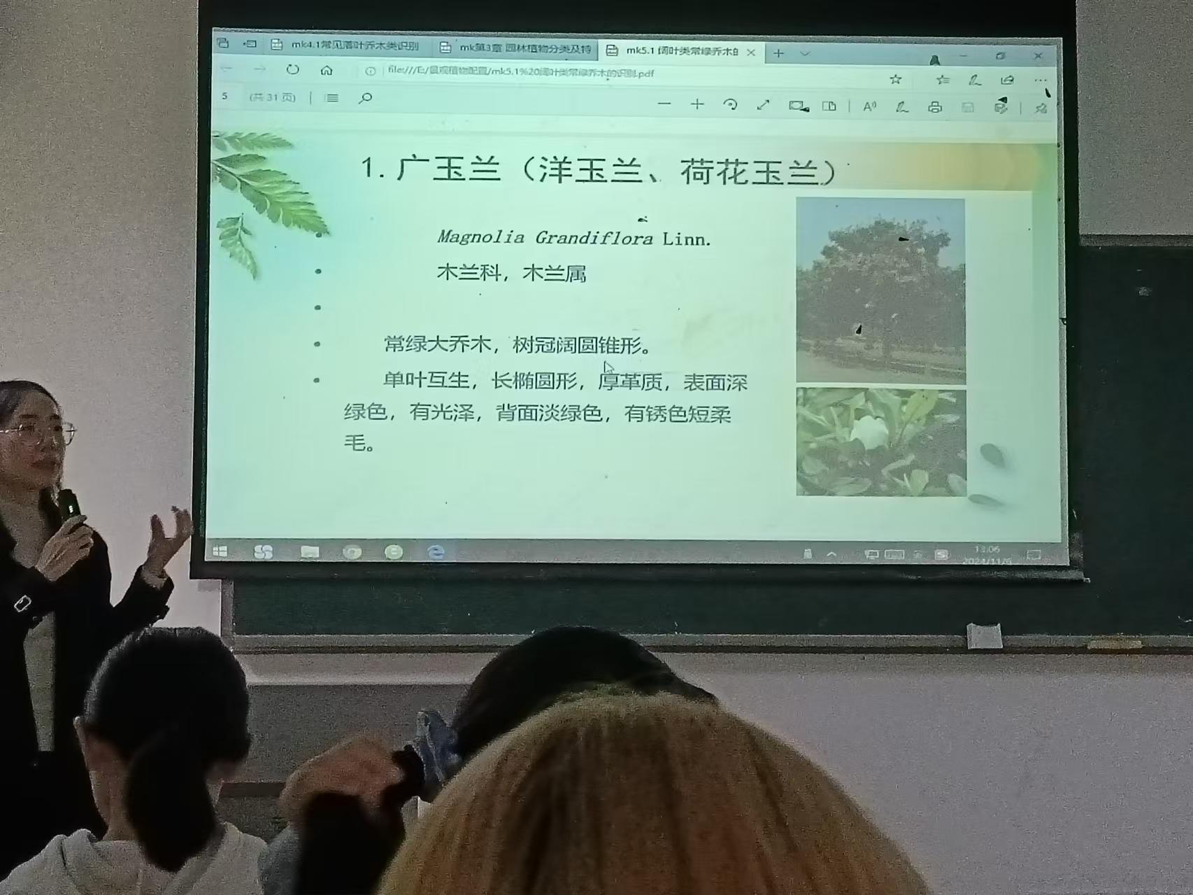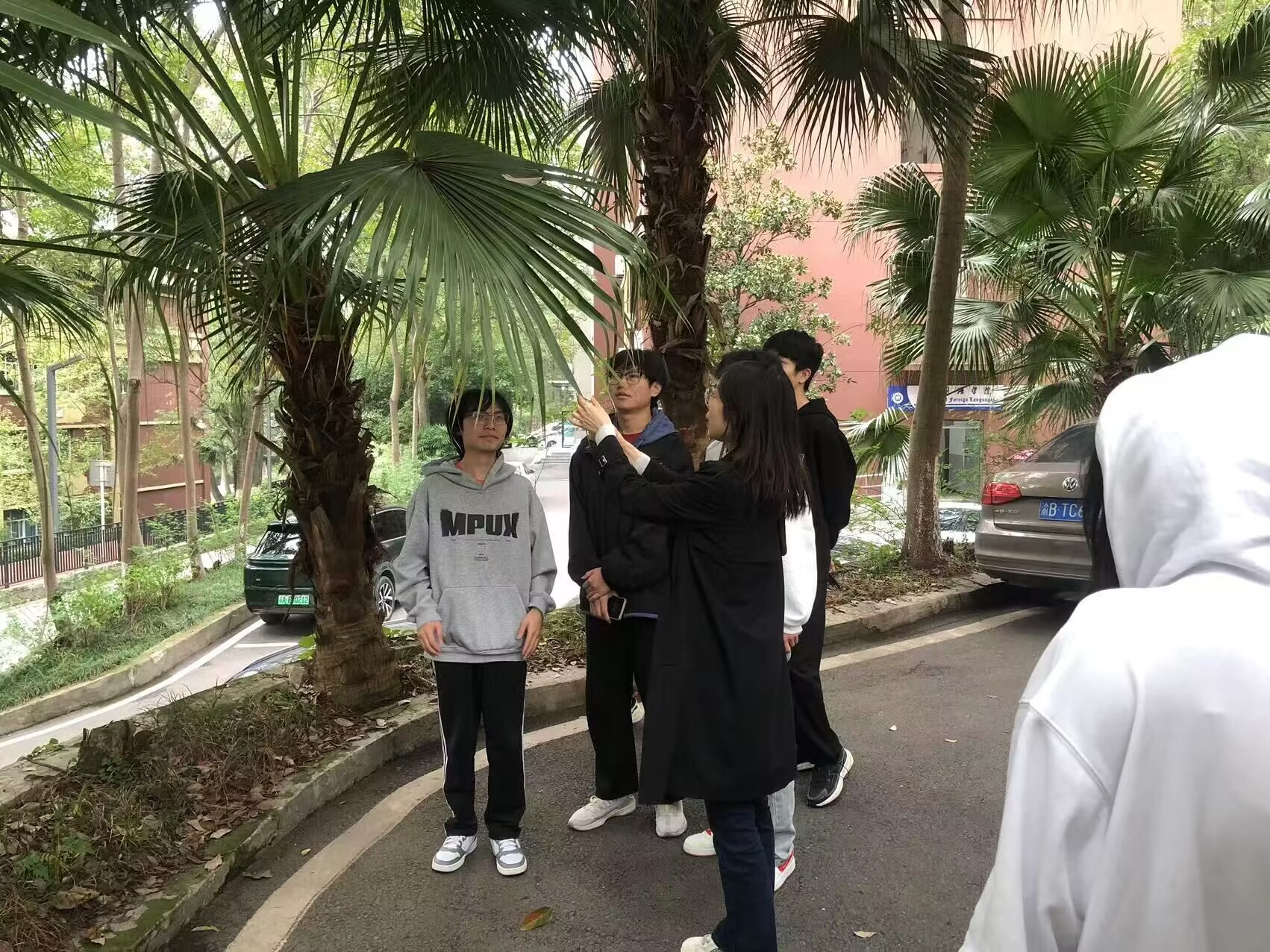 活动分为理论学习和实践认知两部分。活动伊始,龙老师以图片展示结合PPT讲解的形式对常见园林植物进行了简单介绍,例如:乔木的分类,广玉兰、二乔玉兰的识别特征,悬铃木的生活习性等。通过图文介绍,同学们学会了如何鉴别和欣赏常见植物,认识到了植物在大自然中的重要作用。