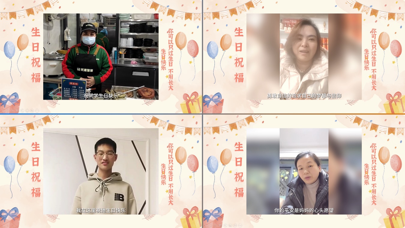 随后,大屏幕亮起,寿星们的家长、朋友、老师以及学校工作人员纷纷出镜,或娓娓道来成长的期许,或回忆往昔的美好瞬间,或送上幽默风趣的俏皮话精心制作的祝福视频,真挚的话语如涓涓细流,淌入每位同学心间,让现场充满了浓浓的温情与感动。
