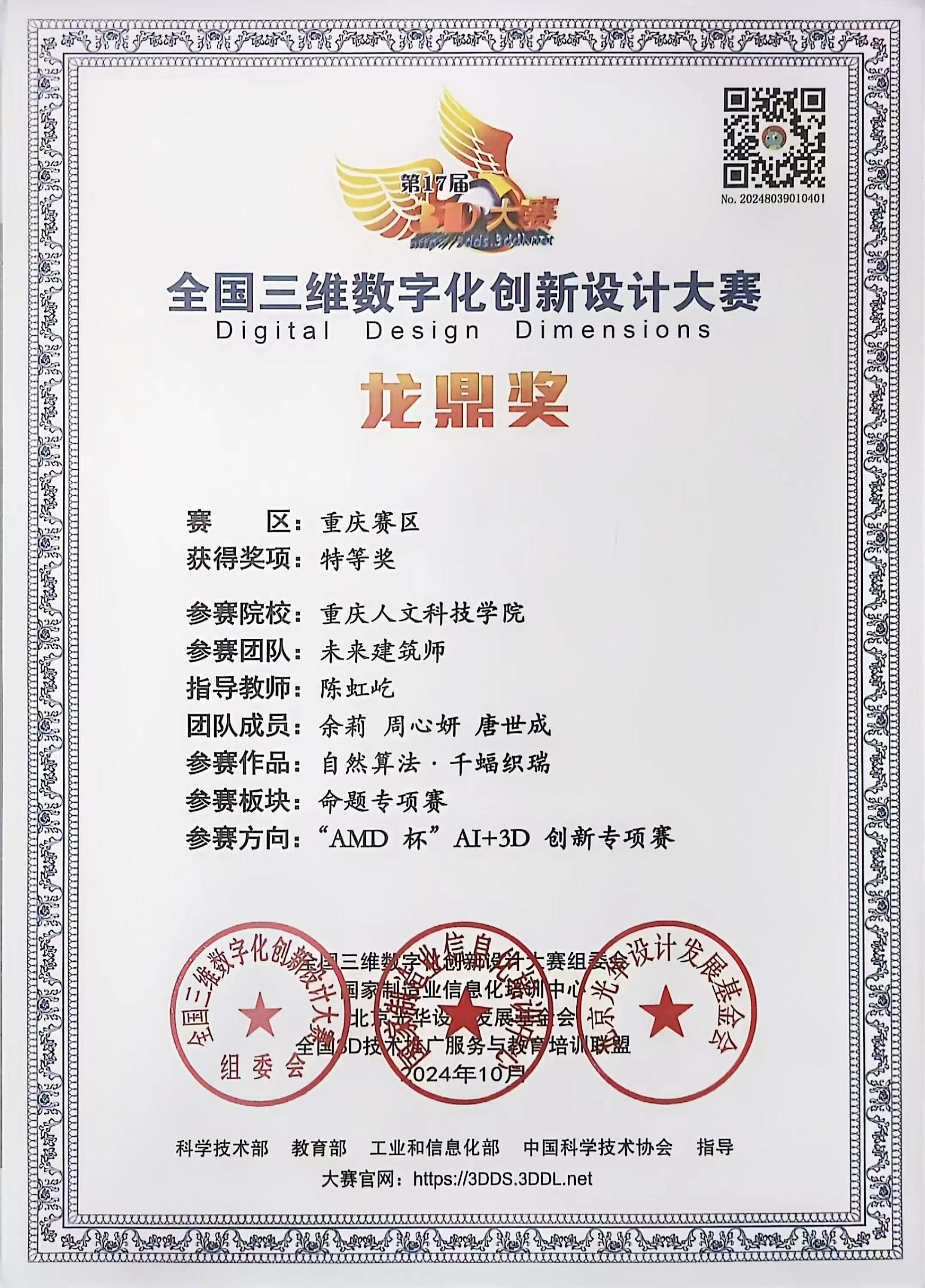 2024第17届全国三维数字化创新设计大赛总决赛在北京理工大学落幕。我院学生余莉、周心妍、唐世成的作品《自然算法·千蝠织瑞》获国赛一等奖,重庆人文科技学院获组织奖。