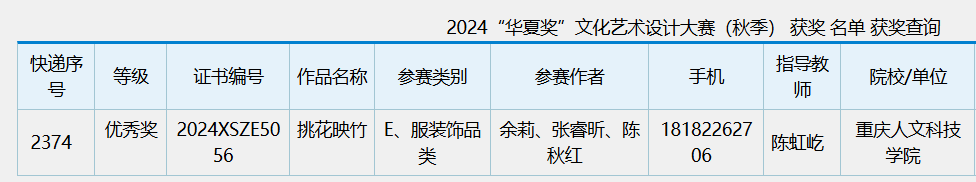 2024年11月25日,“华夏奖”文化艺术设计大赛(秋季)落幕,我院学生余莉、陈秋红、张睿昕的作品《挑花映竹》获优秀奖。该赛事旨在融合艺术设计与科技创新,推动文化艺术繁荣,吸引了全国高校广泛参与。