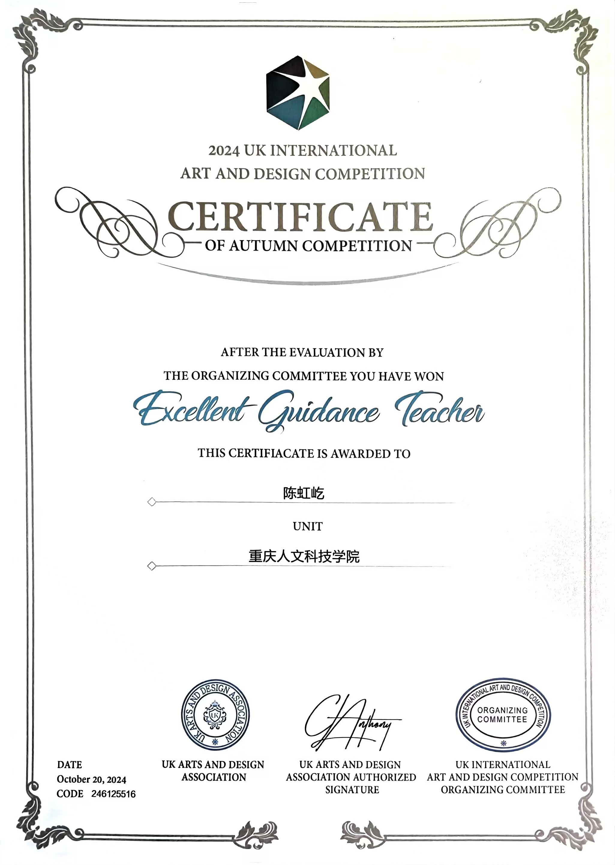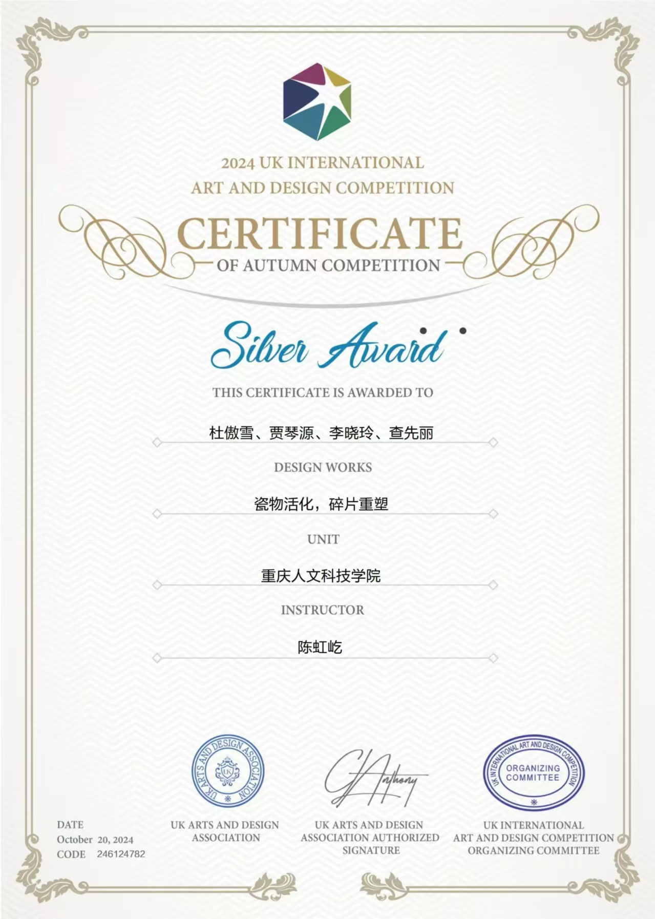 2024年10月15日,英国国际艺术设计大赛(秋季)落幕,我院学生作品《瓷物活化,碎片重塑》获银奖,陈虹屹老师获优秀指导奖。该大赛由英国艺术设计协会主办,面向全球开放,旨在促进艺术设计创新与交流,发掘新锐人才。大赛共征得600余所海内外单位的优秀作品。