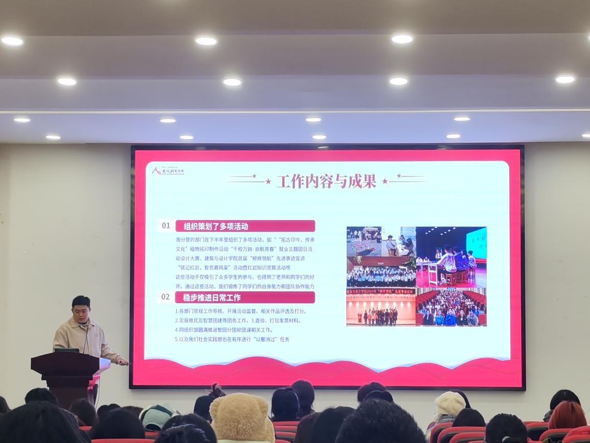 2025年1月3日,建筑与设计学院团总支、学生会2024-2025学年秋期述职大会在雕塑园报告厅顺利举行。此次大会旨在总结本学期团总支、学生会工作成果,分享经验,促进各部门间的交流与协作。建筑与设计学院党总支书记唐湘晖、团总支书记王珍妮参加了本次会议。