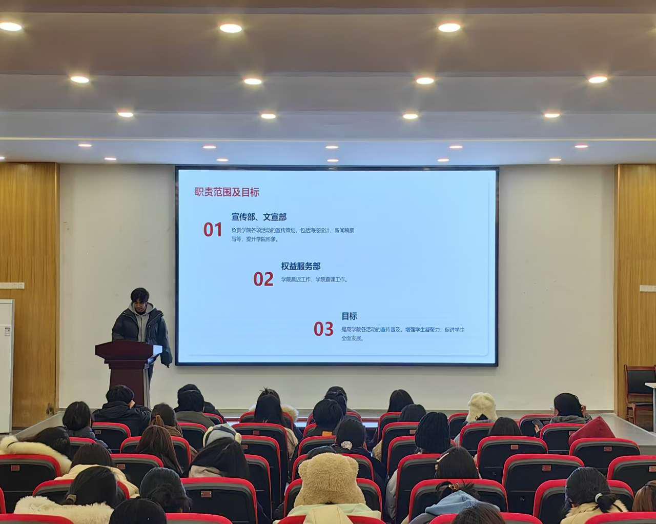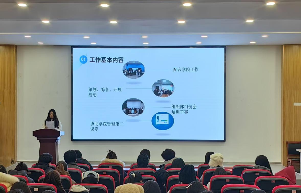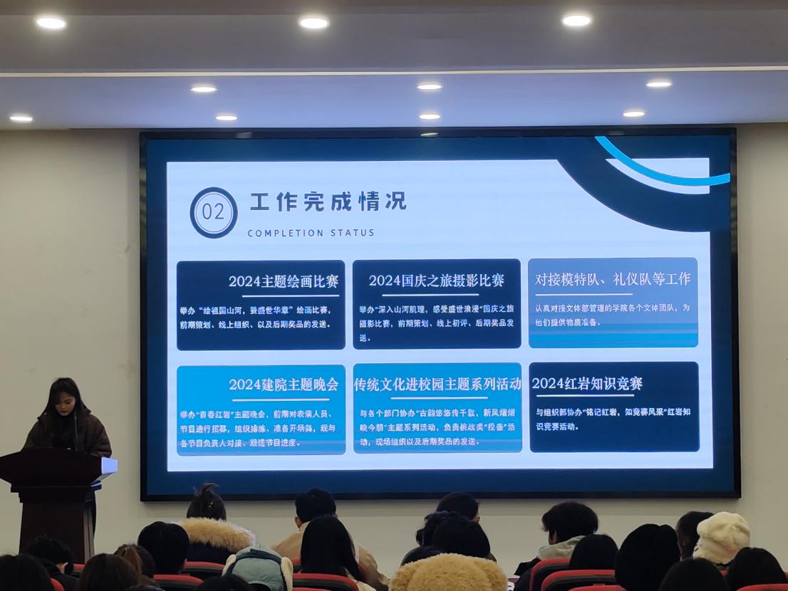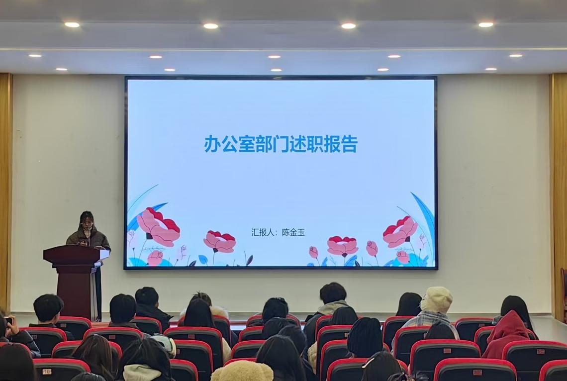 首先由各部门负责人依次上台述职,通过丰富的数据、生动的图片和详细的事例,全面展示了本学期部门工作开展的情况、取得的成绩、存在的不足以及改进的方向措施。从精彩纷呈的校园文化活动,到严谨规范的内部管理与团队建设,各部门的工作亮点纷呈,充分显示了2024年学院团总支、学生会所取得不菲成绩和学生干部一年时间的辛苦工作与努力。