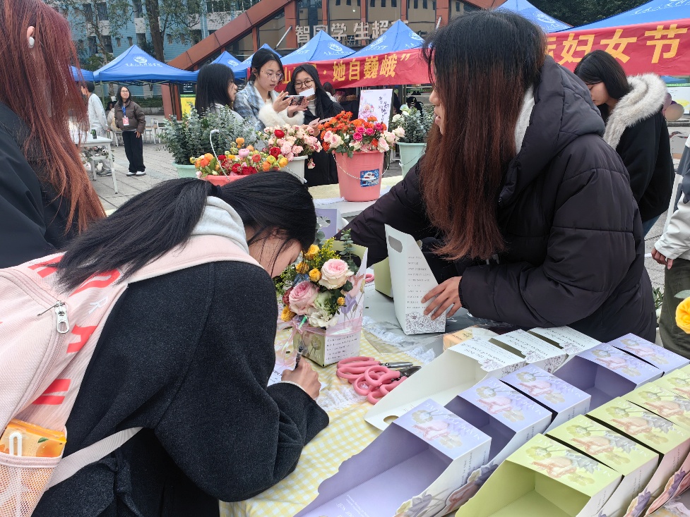 为庆祝第115个“三八”国际妇女节,弘扬新时代女性力量,2025年3月8日,由团工委主办,建筑与设计学院团总支承办的“青山不墨,她自巍峨”主题活动在智园民族团结广场顺利开展。通过甜点制作、创意插花、非遗戳绣、美妆体验等活动吸引了近五百余名师生热情参与。