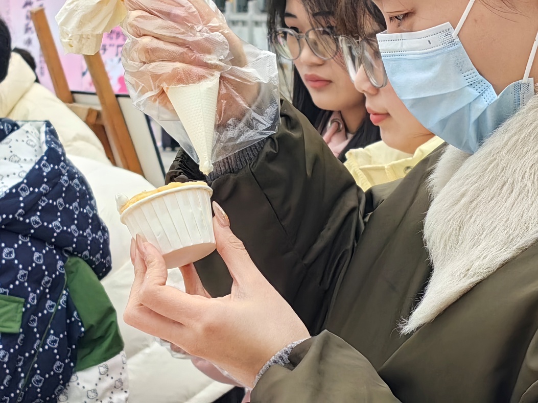 在甜品制作体验区,师生们化身“甜品设计师”,亲手制作裱花蛋糕,以奶油勾勒花卉、蝴蝶等自己喜爱的图案,将女性对生活的热爱融入甜品的每一处细节。大家捧着自己设计蛋糕笑道:“这份甜蜜是送给自己的节日礼物。”