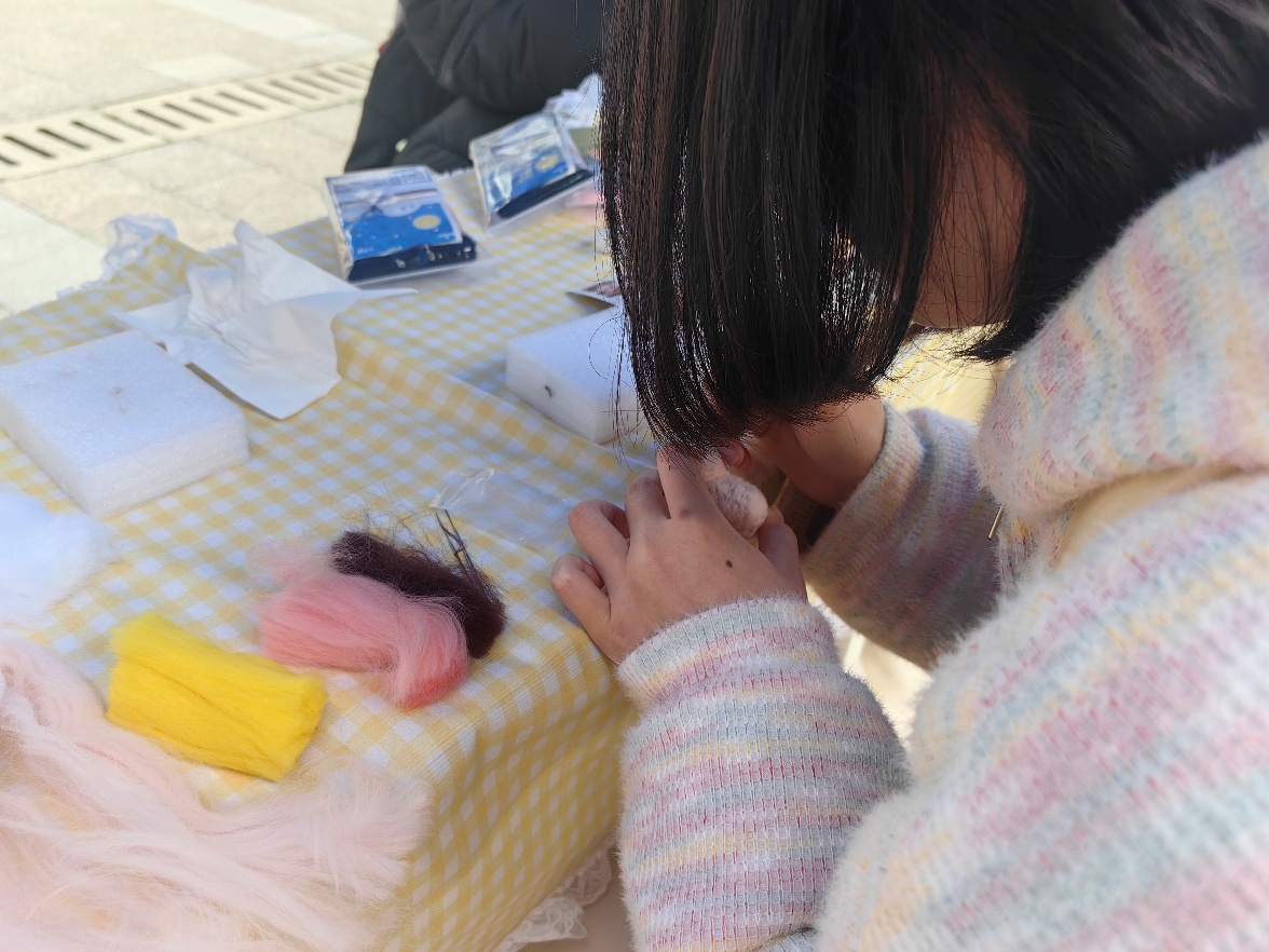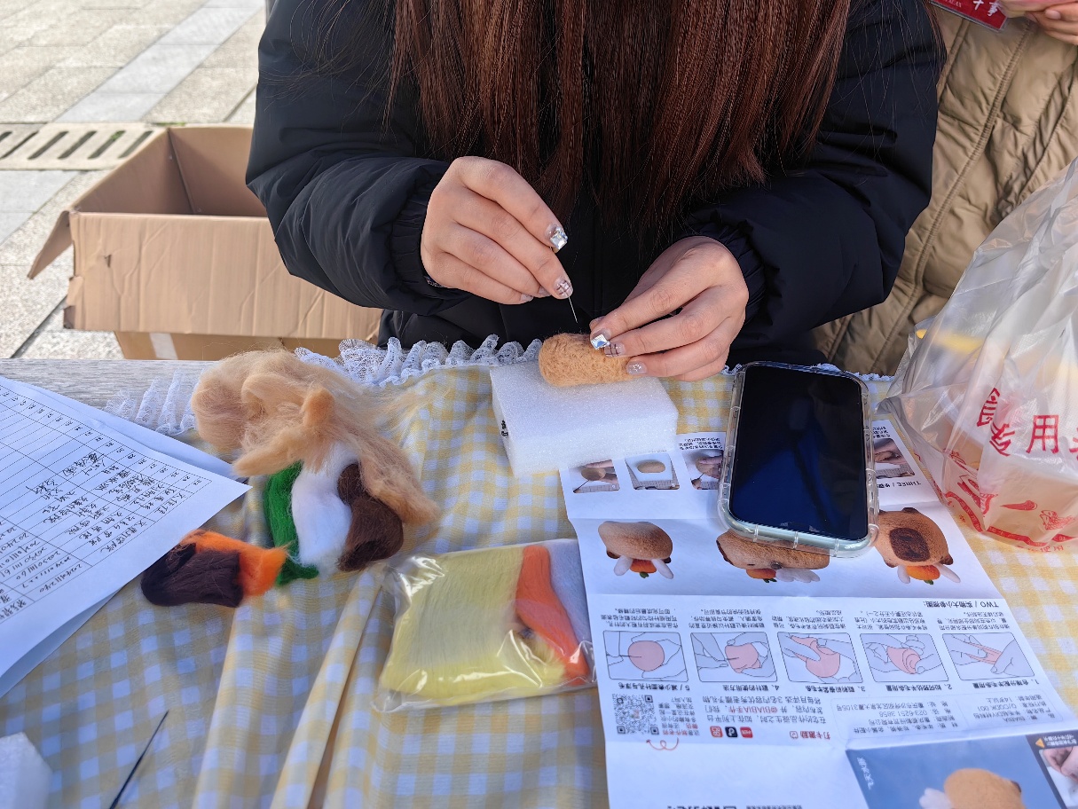 戳绣体验区也是热闹非凡,师生们以针为笔、布为卷,戳出自己喜爱的图案,在一针一线间,传统工艺与现代设计碰撞,彰显女性刚柔并济的力量。在美妆区,工作人员向大家科普日常护肤与自然裸妆技巧,倡导“健康底色,自信为妆”,让女性师生们敢于大胆展示自己,在多元审美中探寻最适合自己的表达方式。