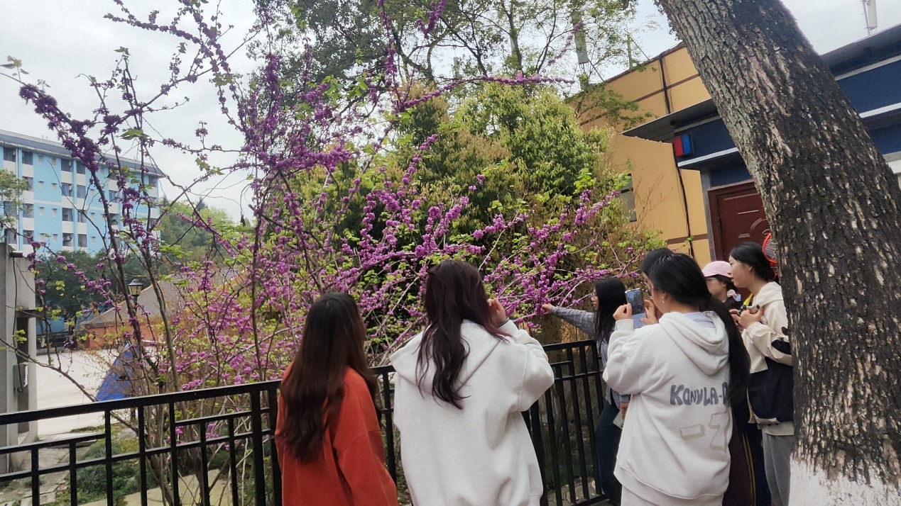 途中,龙老师向大家介绍了日本晚樱、西府海棠、紫荆、碧桃、二乔玉兰、石竹等多种校园春季开花植物;讲解了植物的特征、生长环境和生态意义等知识,以及有趣的植物故事。通过互动和实地观察,同学们在五感交融中感受生命的律动,探索着植物的奥秘,不仅强化了专业知识,也认识到植物在维持生态平衡等方面的价值,培养了对自然的热爱与敬畏。