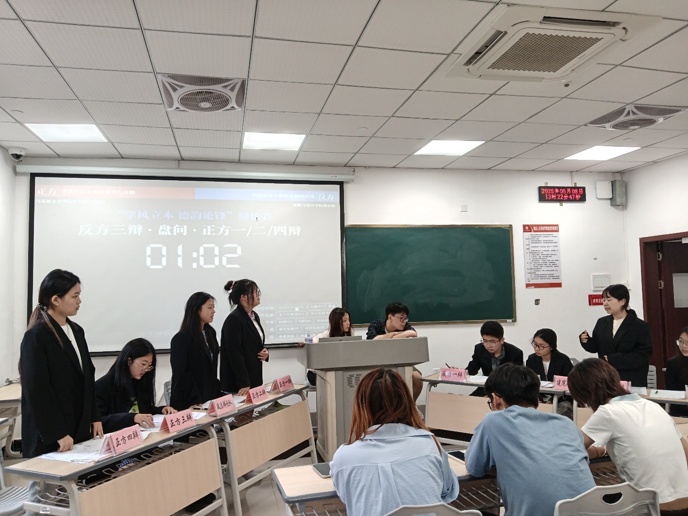 为提升学院学风,提高学生的思辨和表达能力,2025年5月14日,建筑与设计学院在明德楼16205成功开展学风建设月活动之“自律与制度-学习的双翼”辩论赛。建筑与设计学院团总支书记王珍妮、辩论队成员罗丹、罗佳琪、邓丽君等4位师生担任评委。