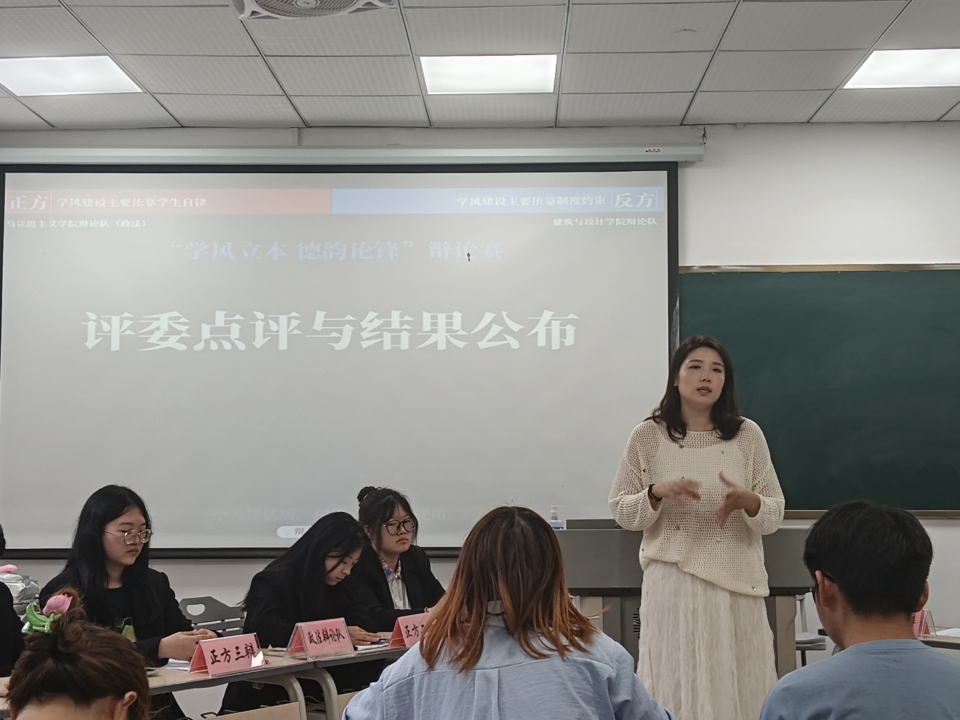 辩论结束后王珍妮老师对本次辩论赛进行了点评,她充分肯定了双方辩手的精彩表现,从辩论技巧、辩论礼仪等方面提出了宝贵建议。她希望同学们能够以本次辩论赛为契机,将良好的学习习惯融入日常学习中,以辩促学、提升自我。将优良的学风内化于心、外化于行。