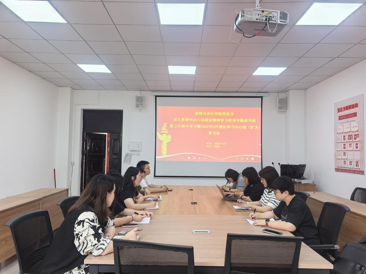 5月15日上午,建筑与设计学院党总支在8203会议室召开深入贯彻中央八项规定精神学习教育专题读书班第二次集中学习暨2025年5月理论学习中心组(扩大)学习会,学院党总支全体委员、党支部书记、园区特设党支部书记、专职组织委员参加会议,学院党总支书记唐湘晖主持会议。