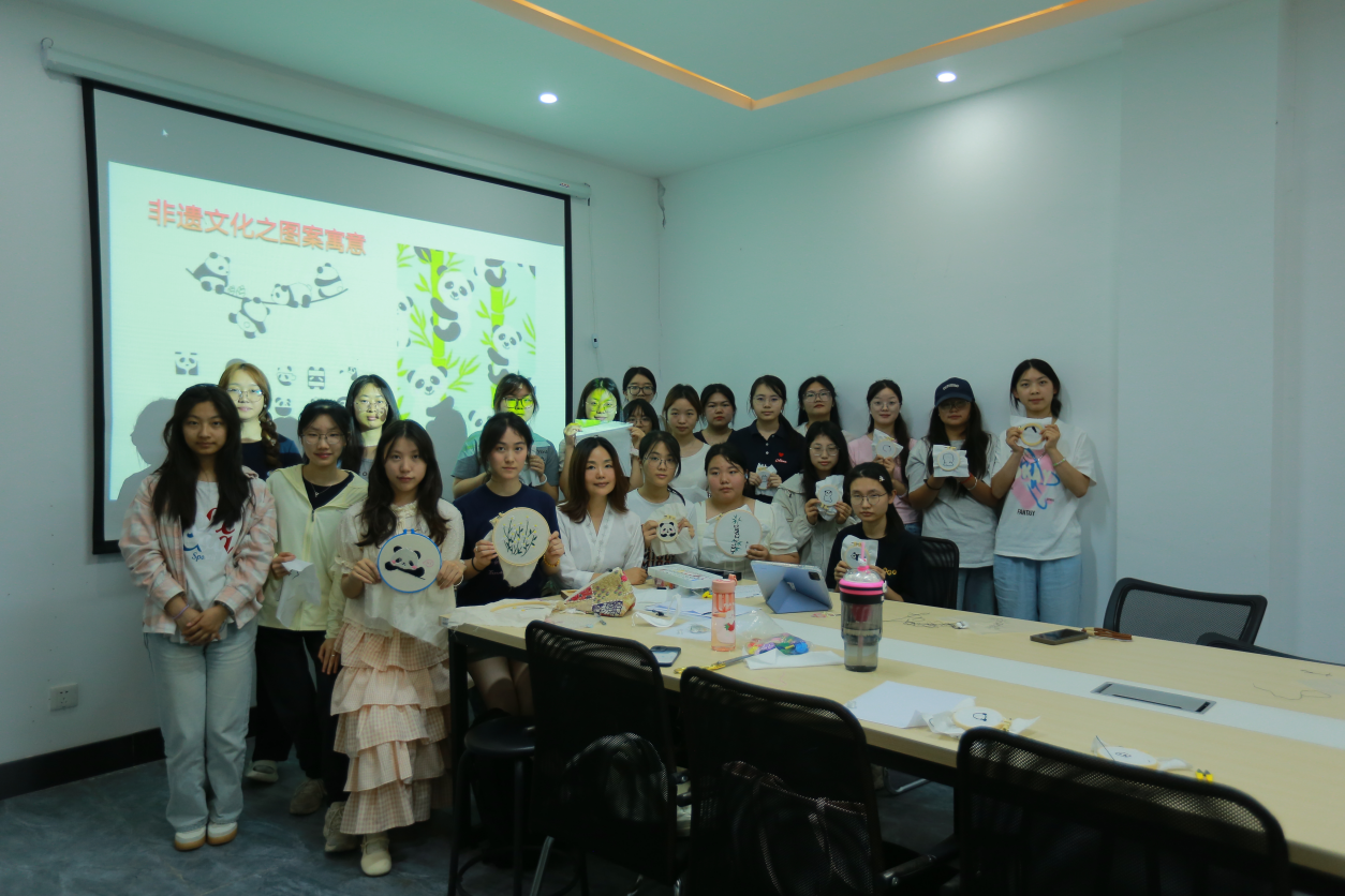 在接下来的核心针法教学环节,由学院服装专业学生担任助教,指导同学们掌握“晕针”“铺针”“滚针”等技法要领,从穿针引线起步,到逐步掌握绣绷固定、丝理走向等基础工艺。作品有色彩淡雅的花卉,有栩栩如生的熊猫图案,同学们以针代笔体悟“工致之美”的创造逻辑,理解“慢劳动”的价值产出。创作完成后大家相互交流心得,分享创作经验,在浓厚的学习氛围中共同进步。