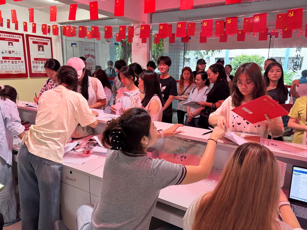楼栋值班老师、志愿者们各司其职、默契配合:信息核对、入学资格审查、寝室分配、钥匙发放等有序进行,报名现场有条不紊。
