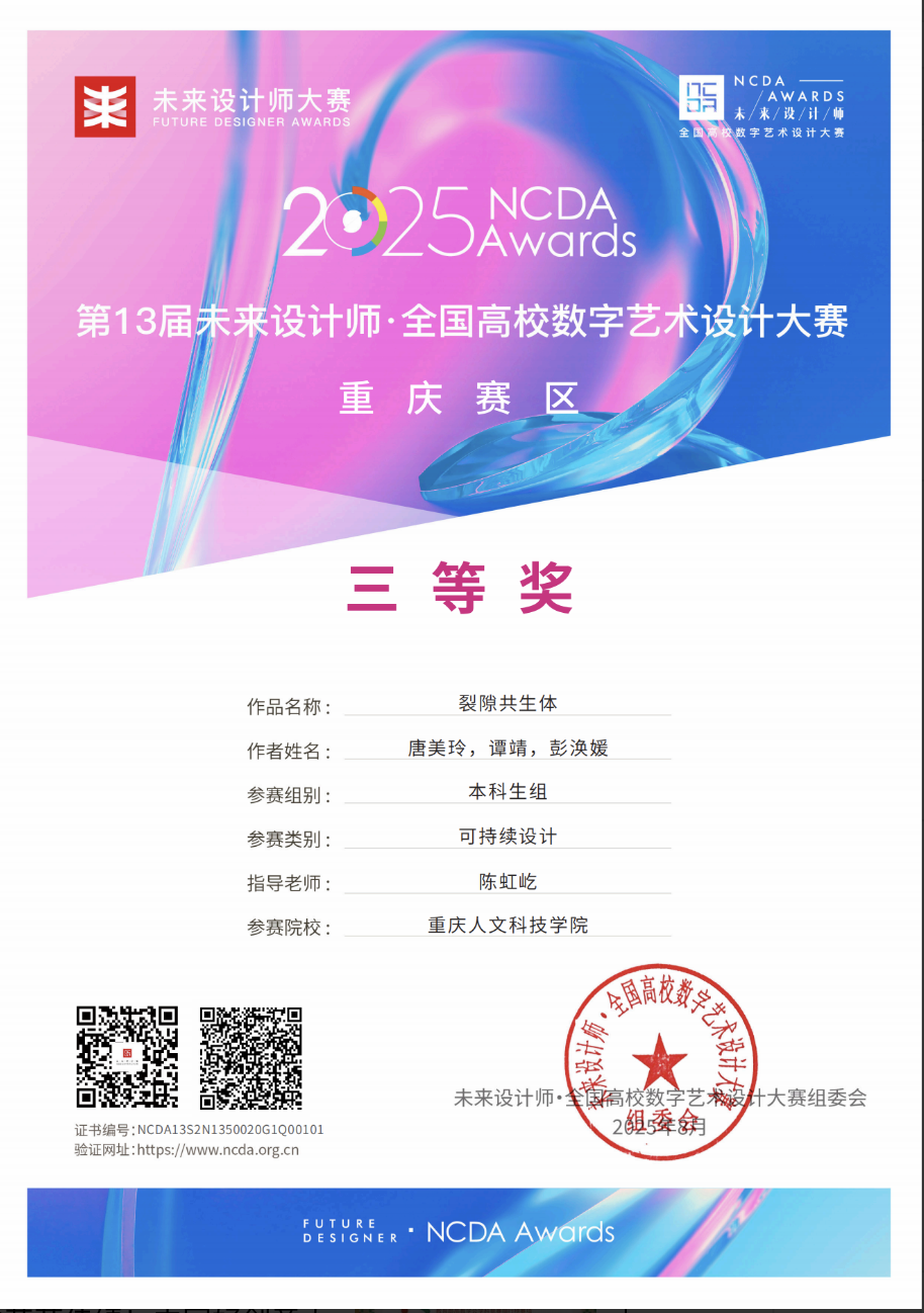 该赛事是我国数字艺术设计领域的重要竞赛平台,旨在推动学科创新发展、深化专业建设,发掘并推广具有创新精神和实践能力的优秀人才与作品。在本届比赛中,由陈虹屹老师指导,学生谭靖、唐美玲、彭涣媛共同完成的作品《裂隙共生体》荣获“可持续设计赛道”重庆赛区三等奖。此次获奖充分体现了在数字艺术设计与可持续发展理念深度融合方面的积极探索与成效,展现了我院师生扎实的专业能力与突出的创新意识。