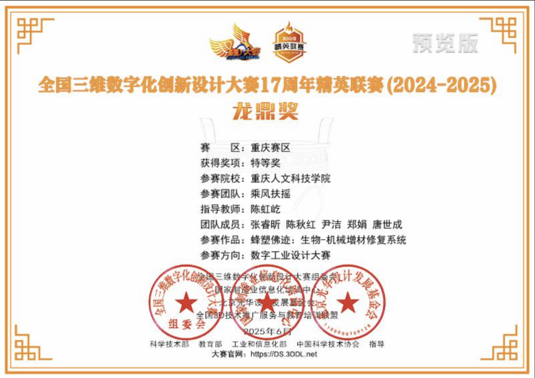 该赛事是我国三维数字化创新设计领域的重要竞赛平台,旨在推动学科创新发展、深化产学研融合,发掘并推广具有创新精神和实践能力的优秀人才与作品。在本届比赛重庆赛区中,由陈虹屹老师指导,学生张睿昕、陈秋红、尹洁、郑娟、唐世成共同完成的作品《蜂塑佛迹:生物-机械增材修复系统》荣获“数字工业设计大赛方向”特等奖。此次获奖充分体现了在数字工业设计与生物机械技术深度融合方面的积极探索与成效,展现了我校师生扎实的专业能力与突出的创新意识。赛事始终紧扣国家战略需求,助力高校原创成果落地转化,已成为参与面广、院校关注度高、行业认可度强的标杆性竞赛。