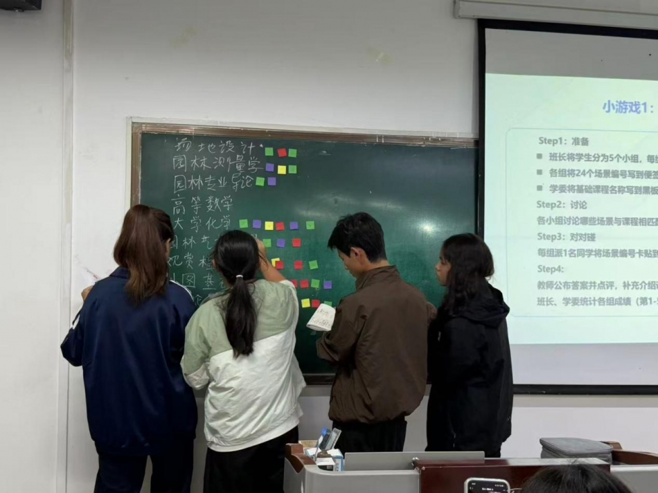 首个活动通过“园林基础课程场景对对碰”游戏,要求学生分组匹配24个专业场景与相应课程。在这个过程中,学生们自然而然地扮演起“小先生”角色,互相讲解课程内容与实际应用的关联。
