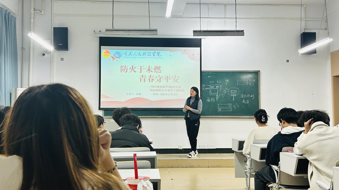 2025年11月13日晚,重庆人文科技学院建筑与设计学院2025级建筑学3班在8教106教室组织开展了“防火于未燃·青春守平安”主题团课及班徽设计大赛。本次活动由建筑教研室主任、班主任莫文静与班长陈阳共同策划主持,围绕学校“心怀师陶之志,践行学陶之路”主题教育要求,融合专业特色与校园文化建设,引导学生将陶行知先生“生活即教育”“教学做合一”的教育理念转化为具体行动,提升安全意识,增强班级凝聚力。