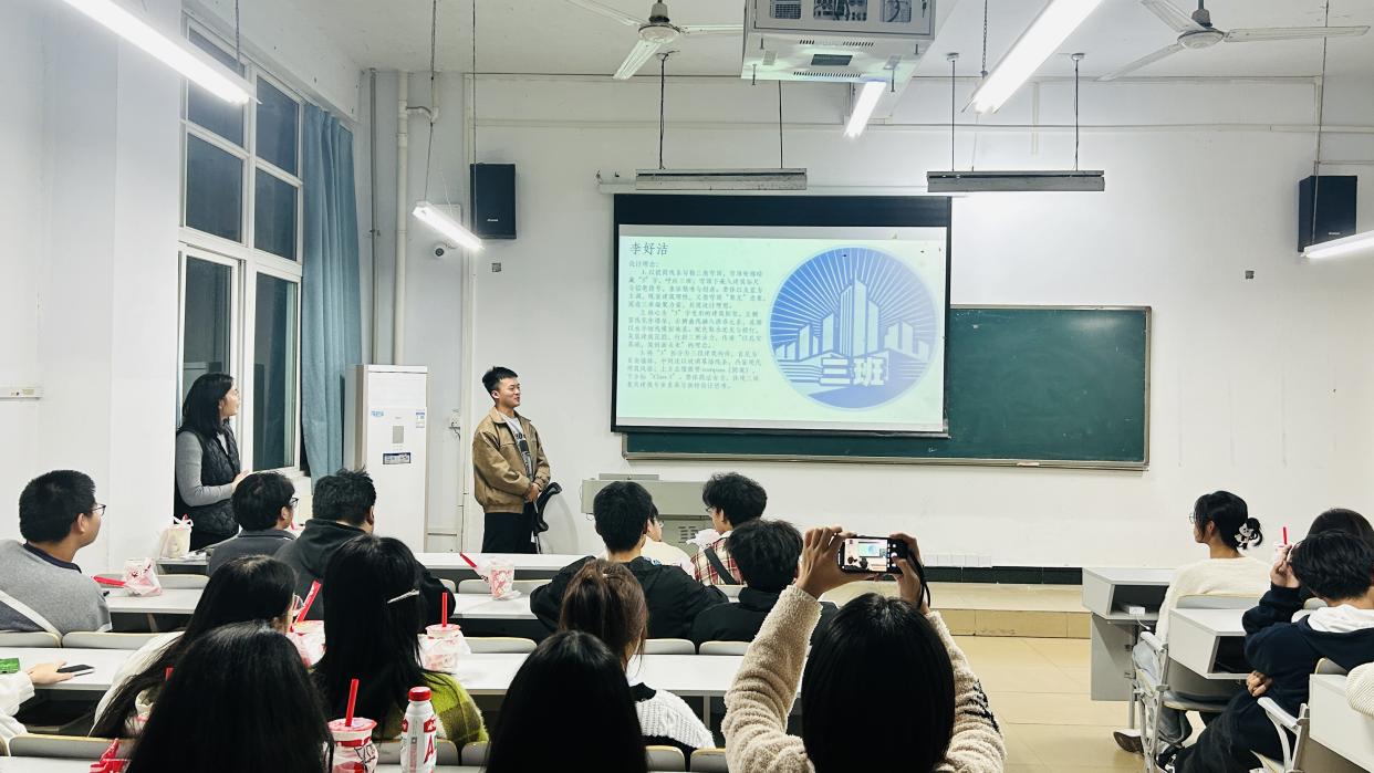 第二阶段的班徽设计交流会由班主任莫文静主持。全班同学积极参与,共提交三十余件设计作品。邓慧娟以建筑元素融合性别数字象征班级团结,樊治莹通过“同心筑梦·叁叁”传递奋进精神,虞希贝则以古典柱式与橄榄枝传递专业与和谐理念。多位同学上台阐述设计思路,现场气氛热烈,展现出建筑学子的专业素养与创新意识。班徽评选将采用师生共同投票方式,确保过程公开公正,评选结果将于后续公布。
