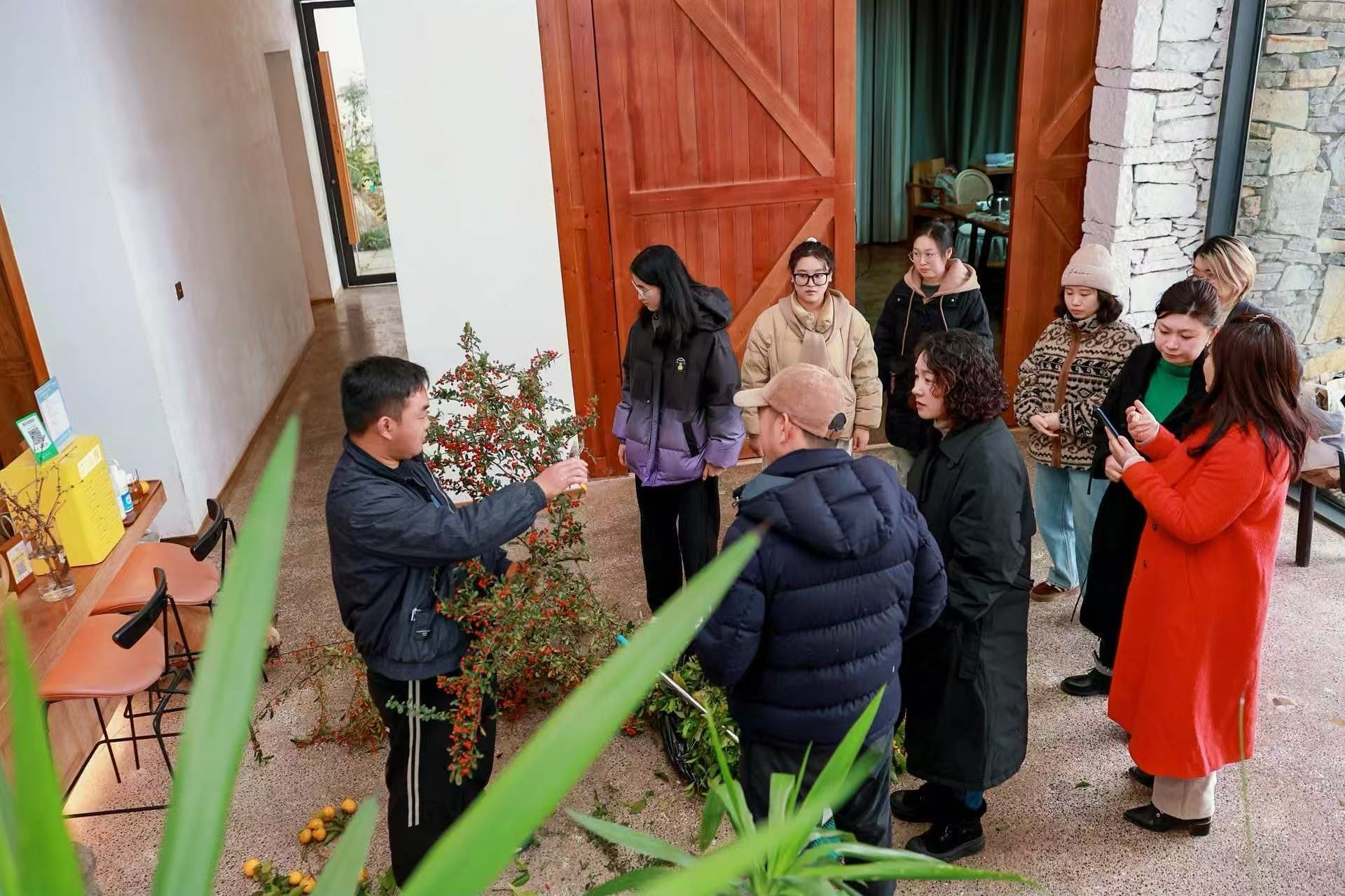 随后,师生与民宿主以及其他优秀的民宿主理人围绕“如何通过设计提升客人复住率”展开深度交流,25级设计2班学生李萌结合课堂所学提问:“客房软装是否可以根据季节调整,既降低成本又保持新鲜感?”得到民宿主的肯定与补充建议,让学生在真实对话中践行“从做中学”。最后,刘丽雅老师带领学生实地参观,以民宿露台景观设计为例,剖析如何利用自然元素提升体验感,让理论在实景中落地。